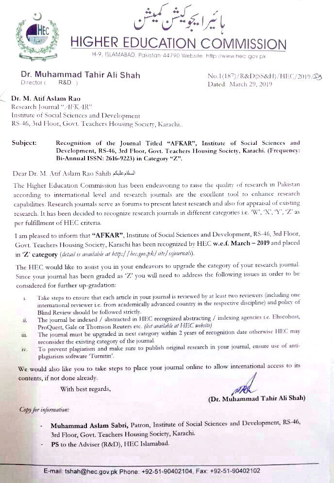 We are glad to share that, In the meeting of HEC sub-committe of Journals of Social Sciences, held on 27th december 2018, “AFKĀR” has been approved by Higher Education Commission of Pakistan.